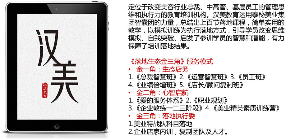 漢美教育系中國服務(wù)行業(yè)(美容行業(yè))實(shí)戰(zhàn)落地的教育品牌,定位于改變美容行業(yè)總裁、中高管、基層員工的管理思維和執(zhí)行力的教育培訓(xùn)機(jī)構(gòu)。教育堅(jiān)持理論指導(dǎo)與實(shí)戰(zhàn)模擬相結(jié)合,大量的科目實(shí)戰(zhàn)模擬訓(xùn)練,學(xué)員可以直接落地到團(tuán)隊(duì)中和企業(yè)里,運(yùn)用獨(dú)特的模擬訓(xùn)練模式穩(wěn)立中國美容行業(yè),為中國從事美容行業(yè)的企業(yè)帶來改變命運(yùn)的漢美力量。